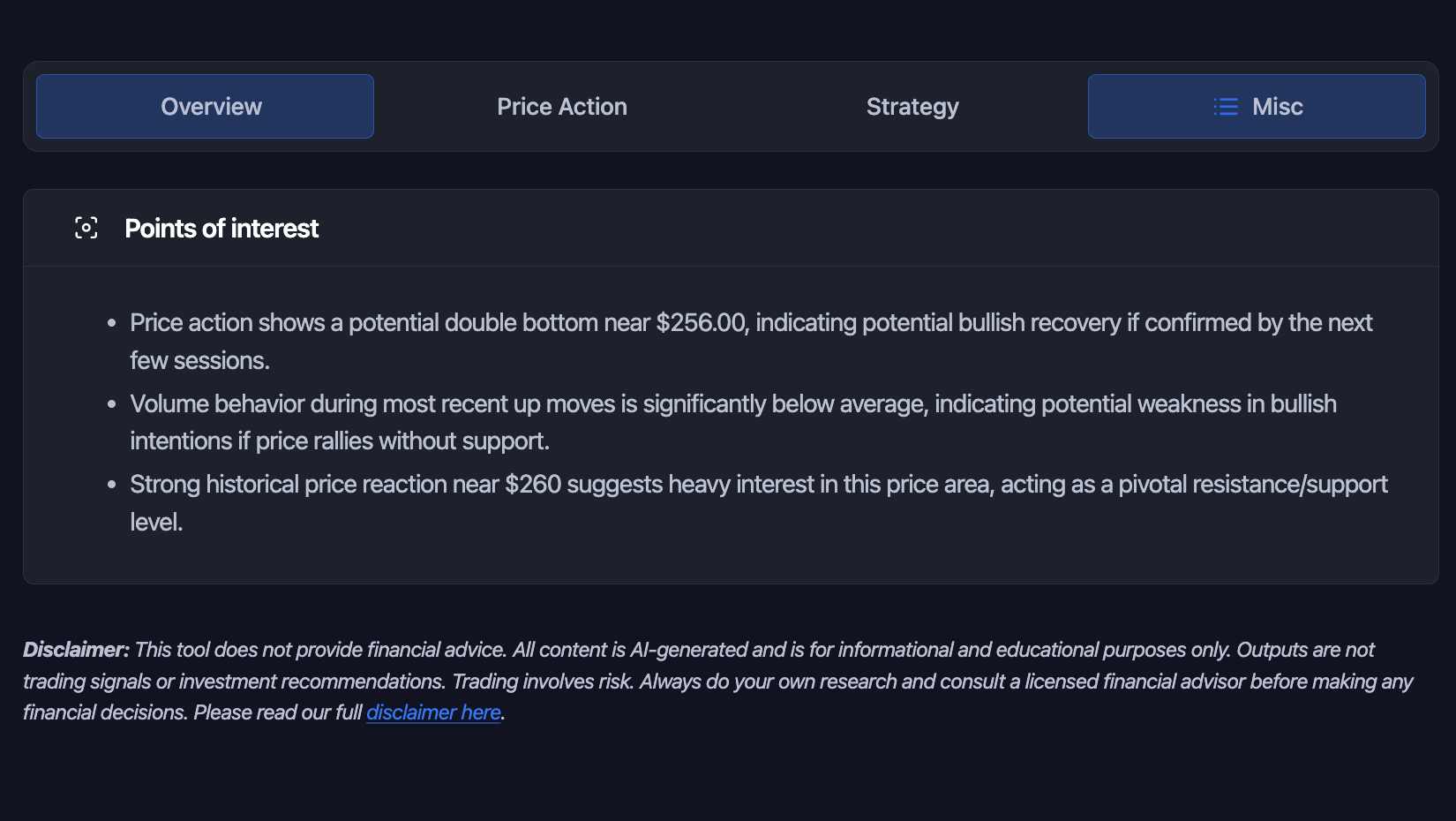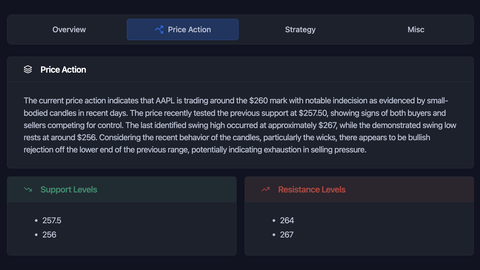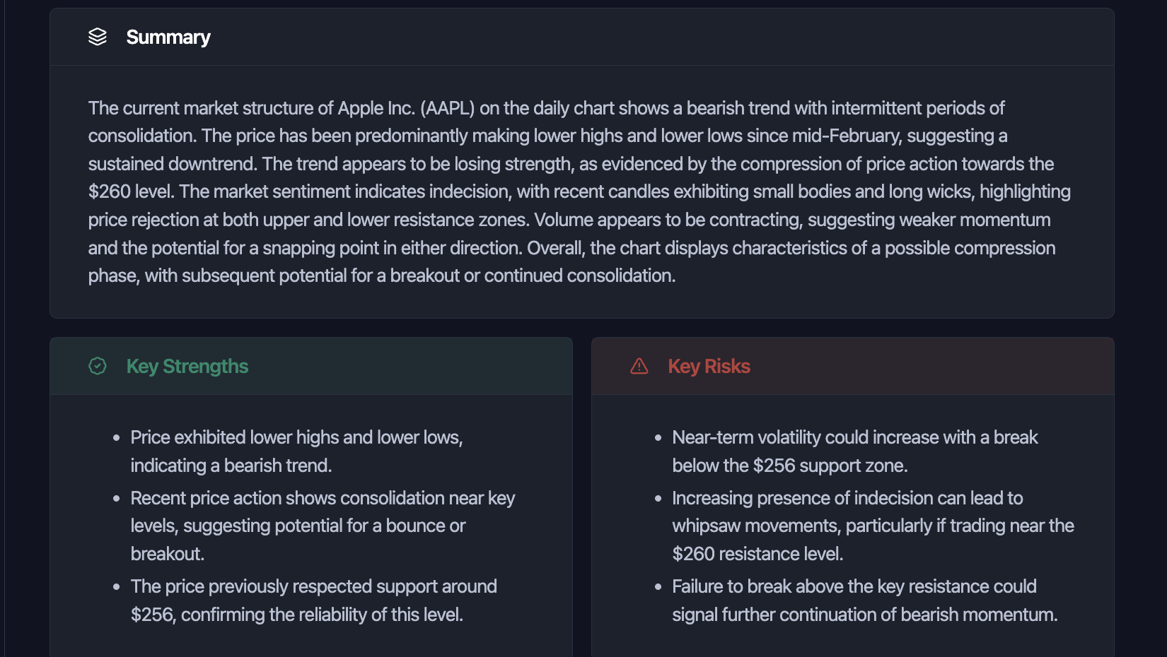 Our AI evaluates price action, structure, momentum, and volatility to generate a structured report.